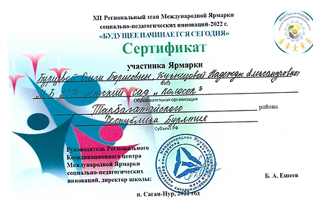 - XII Региональной этап Международной Ярмарки социально - педагогических инноваций 2022 г. «Будущее начинается сегодня» (сертификат участника);